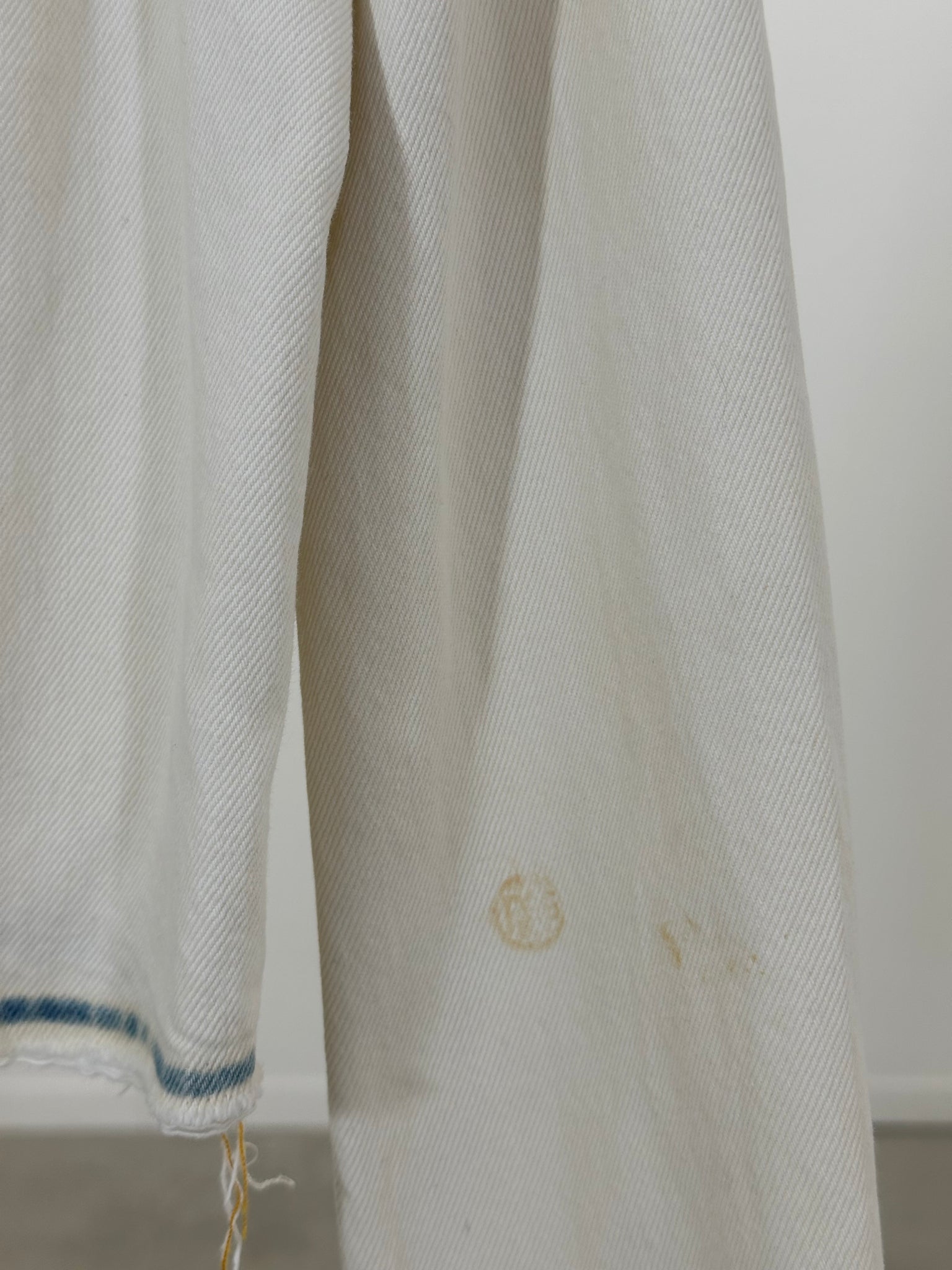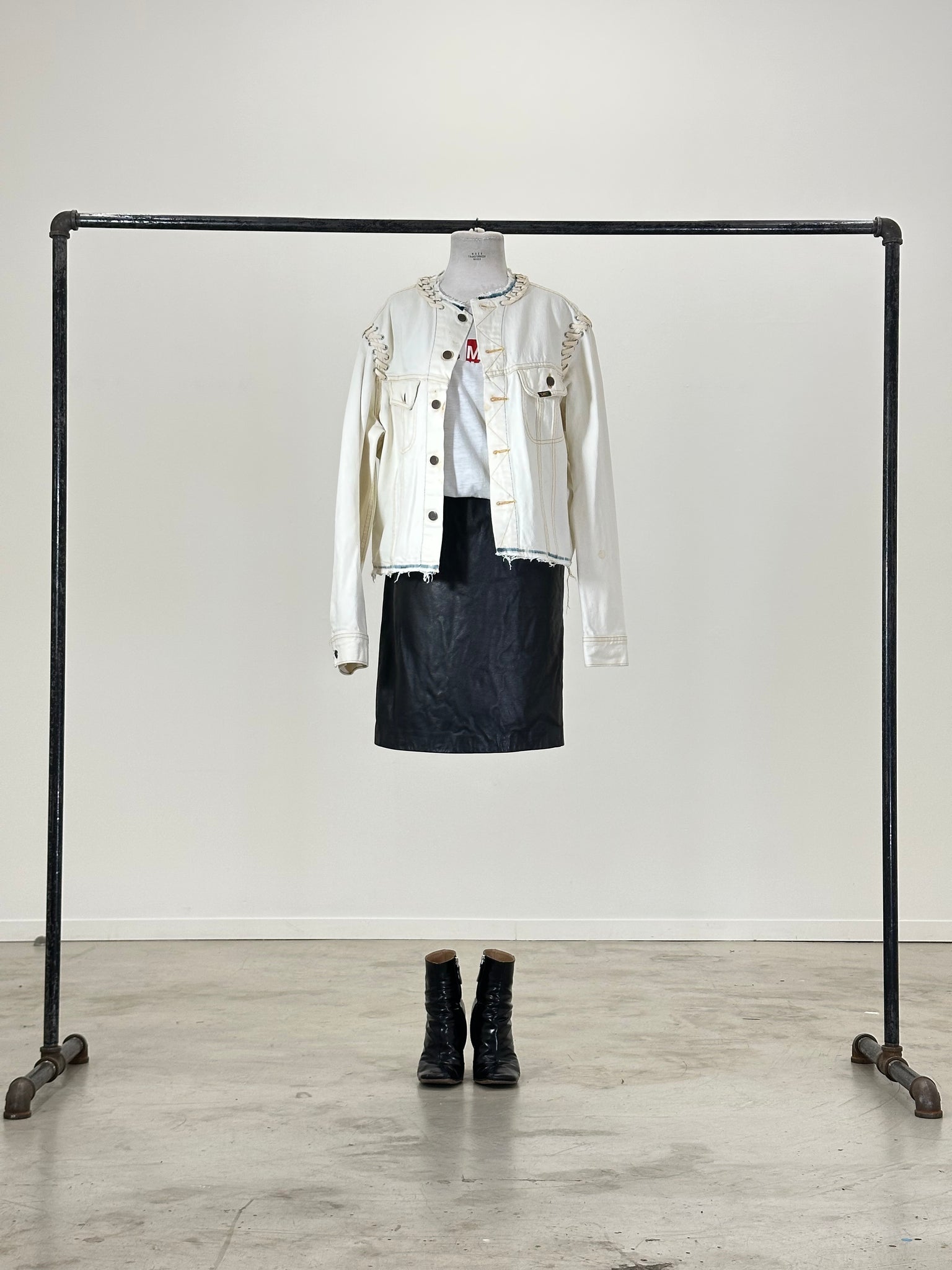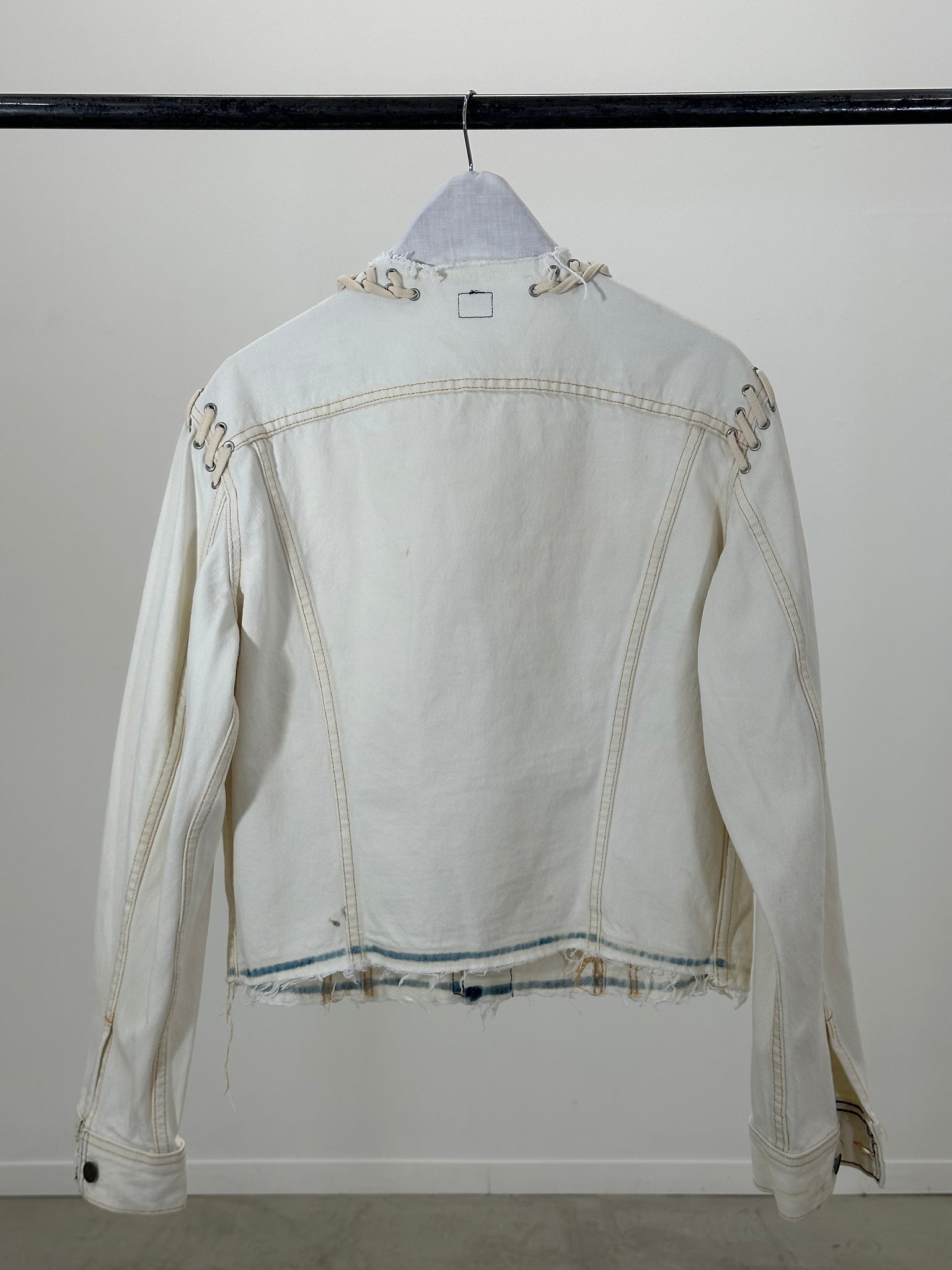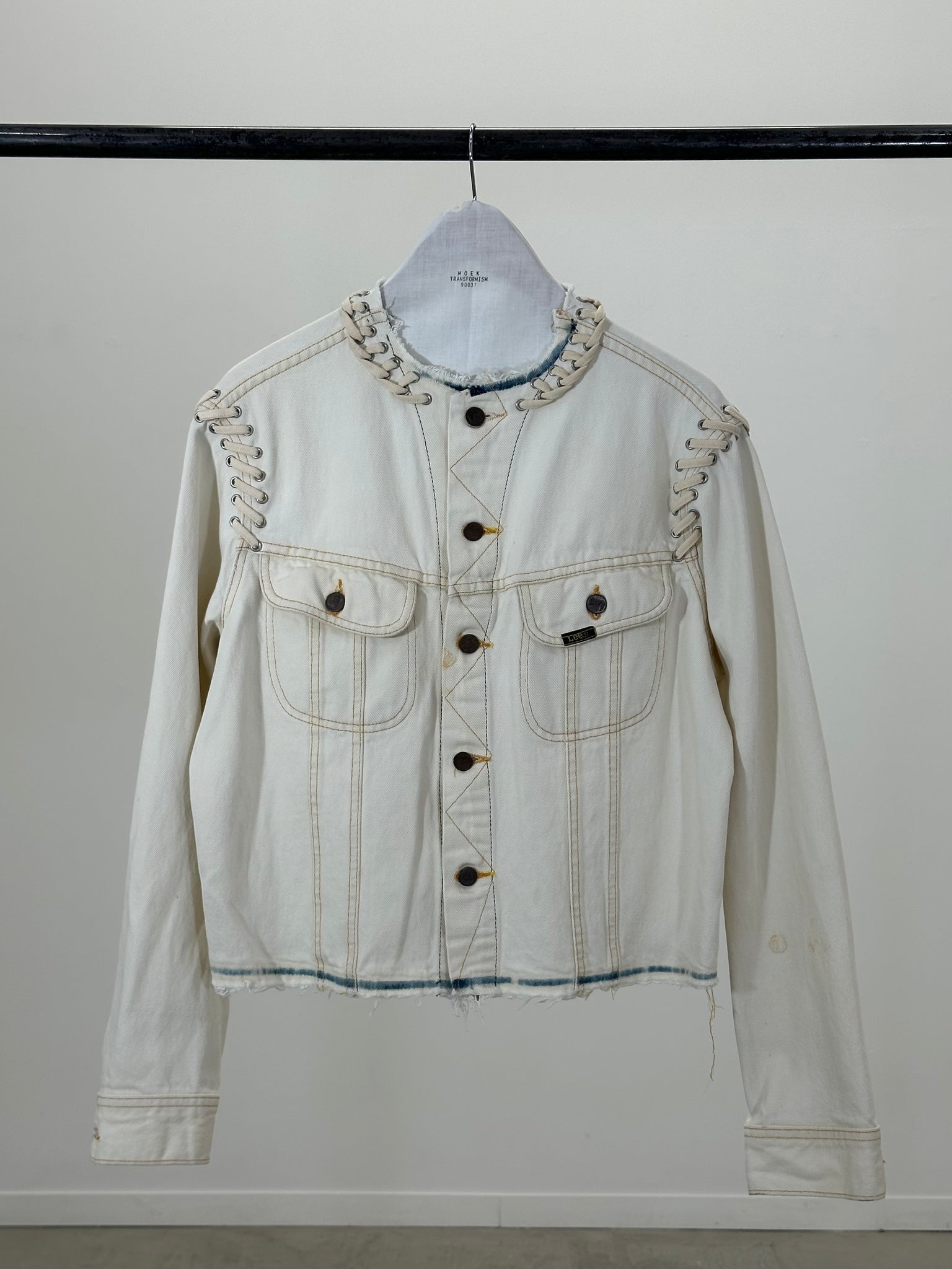 This piece features a vintage denim trucker jacket that has been bleached, resulting in a subtle tone that defies a specific color. After bleaching, the collar and waistband are removed, leaving a hint of the original indigo blue along the seams, adding a distinctive yet understated accent. Eyelets on the collar and sleeves are threaded with fabric cords as a refined design detail. The jacket balances heritage elements with a fresh, fashion-forward aesthetic.