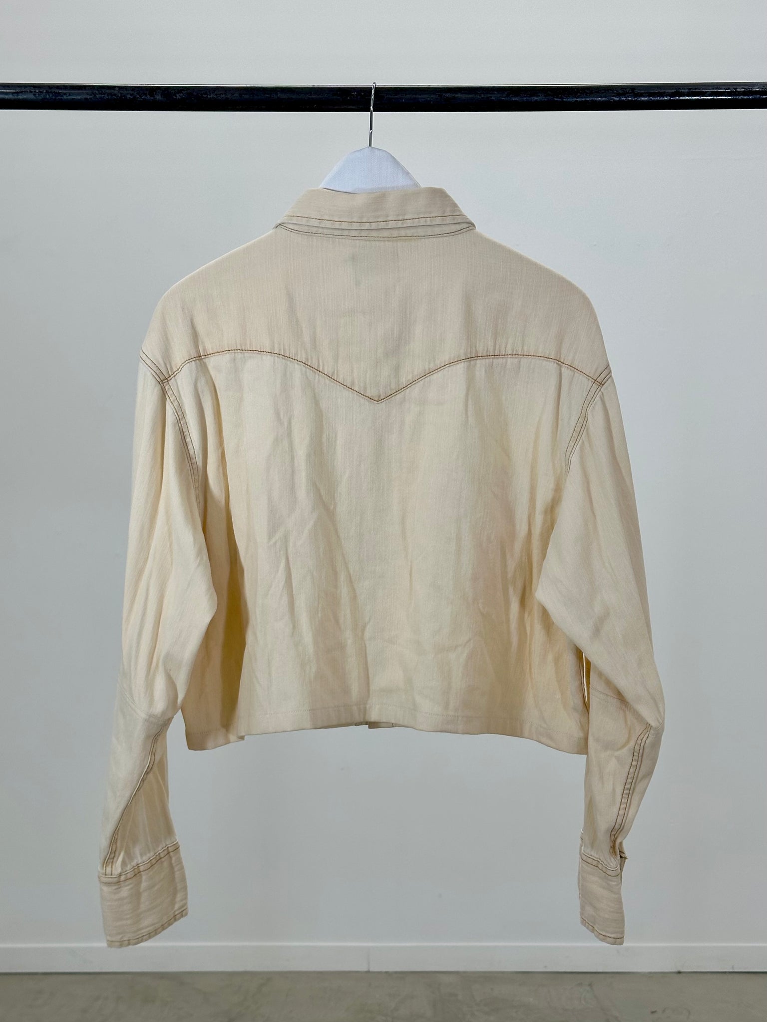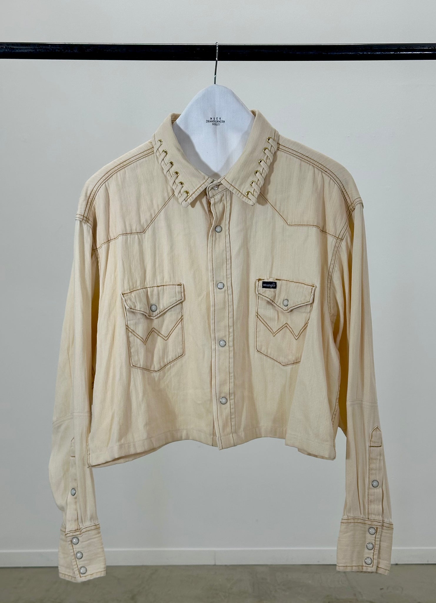 This piece features a vintage denim Western shirt that has been bleached, resulting in a subtle tone that defies a specific color. Subtle eyelets are added to the collar, with fabric cords threaded through as a refined design detail. The silhouette is cropped for a contemporary, modern shape, balancing heritage elements with a fresh, fashion-forward aesthetic.