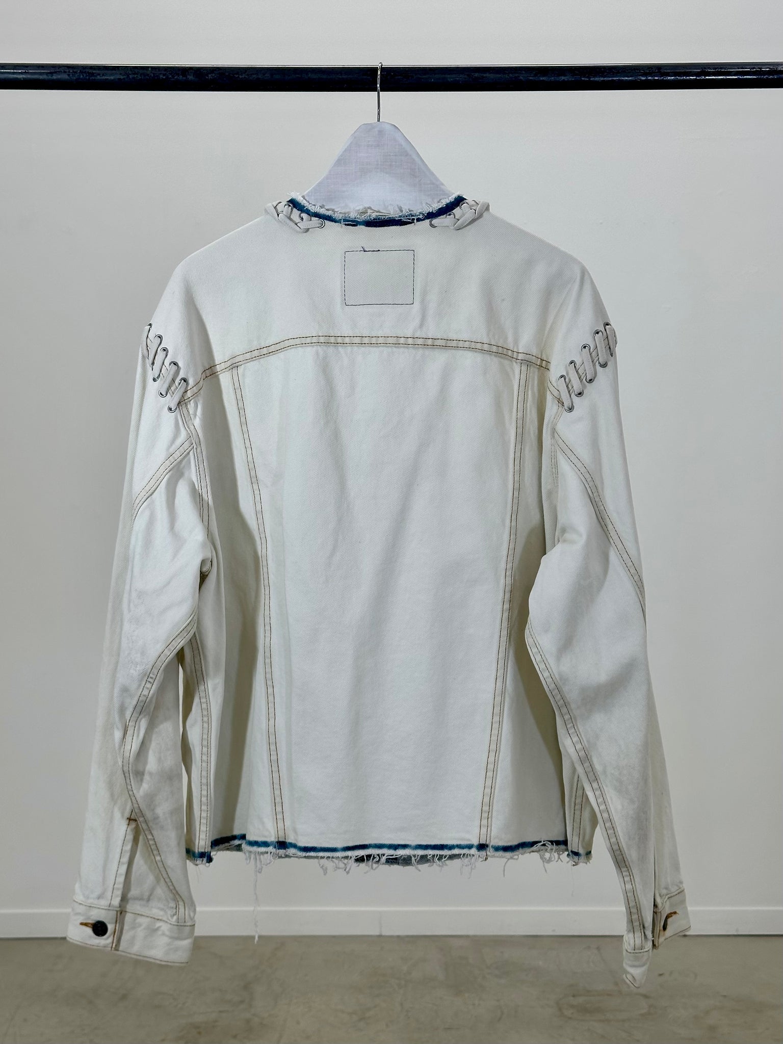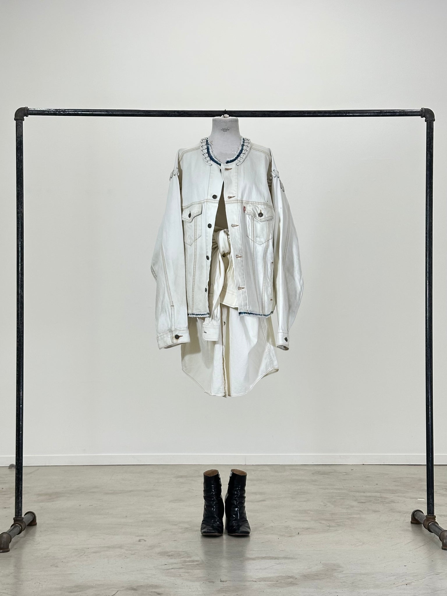 This piece features a vintage denim trucker jacket that has been bleached, resulting in a subtle tone that defies a specific color. After bleaching, the collar and waistband are removed, leaving a hint of the original indigo blue along the seams, adding a distinctive yet understated accent. Eyelets on the collar and sleeves are threaded with fabric cords as a refined design detail. The jacket balances heritage elements with a fresh, fashion-forward aesthetic.