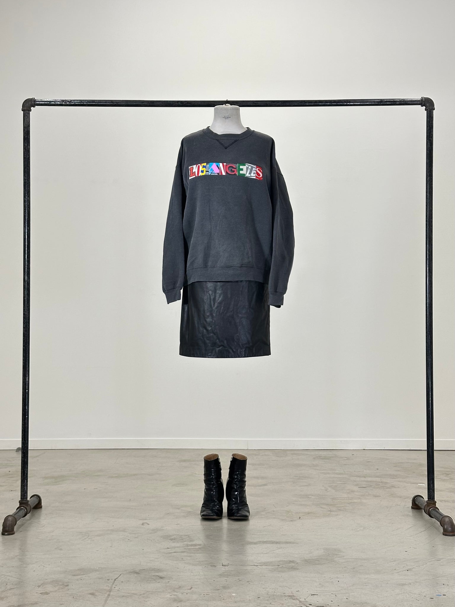 The base body is made from a heavyweight vintage sweatshirt, offering a rich, substantial feel with a refined, shortened length for an elevated silhouette.