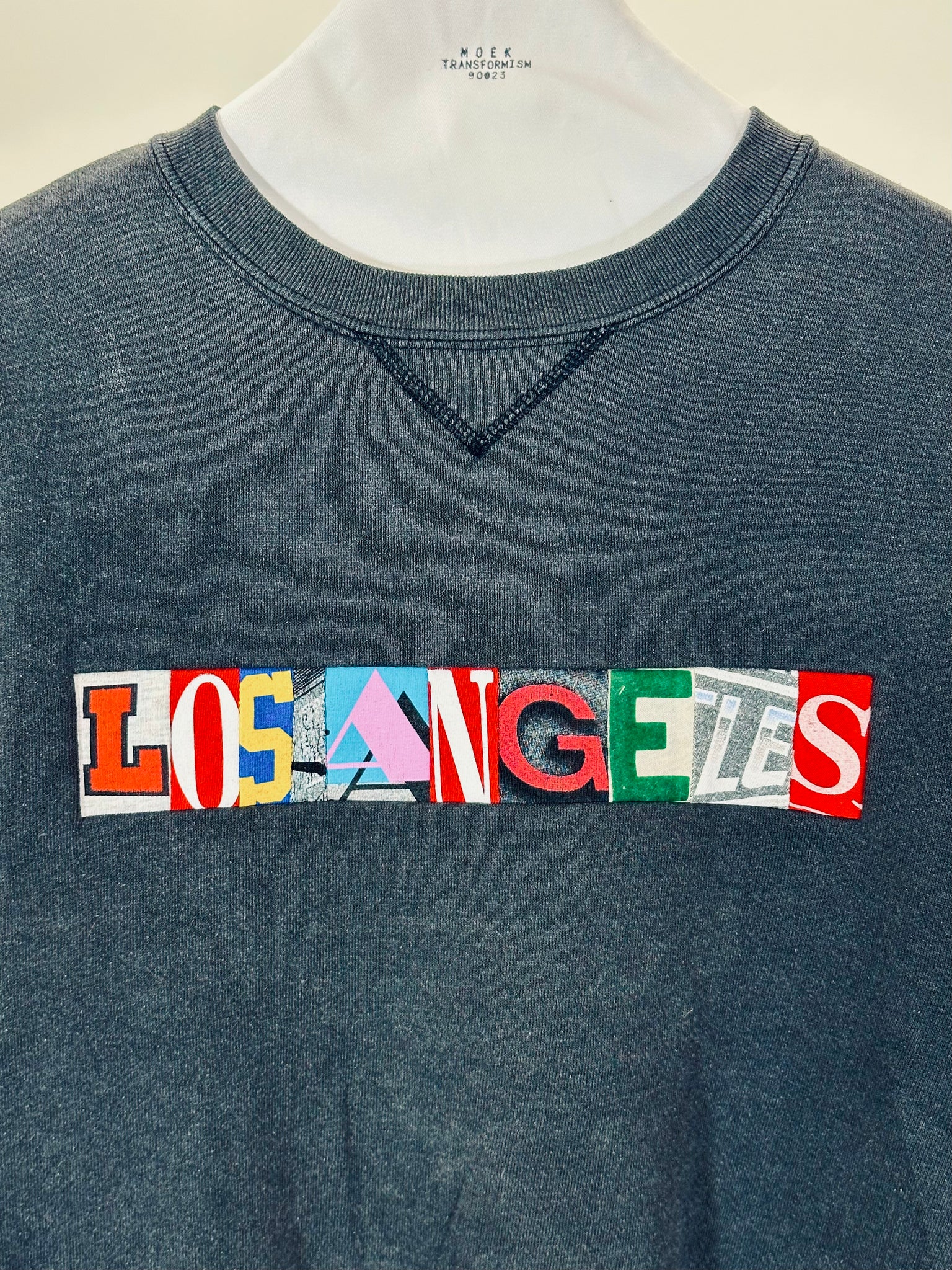 Each letter is cut from vintage T-shirts and individually stitched to create a truly one-of-a-kind graphic.