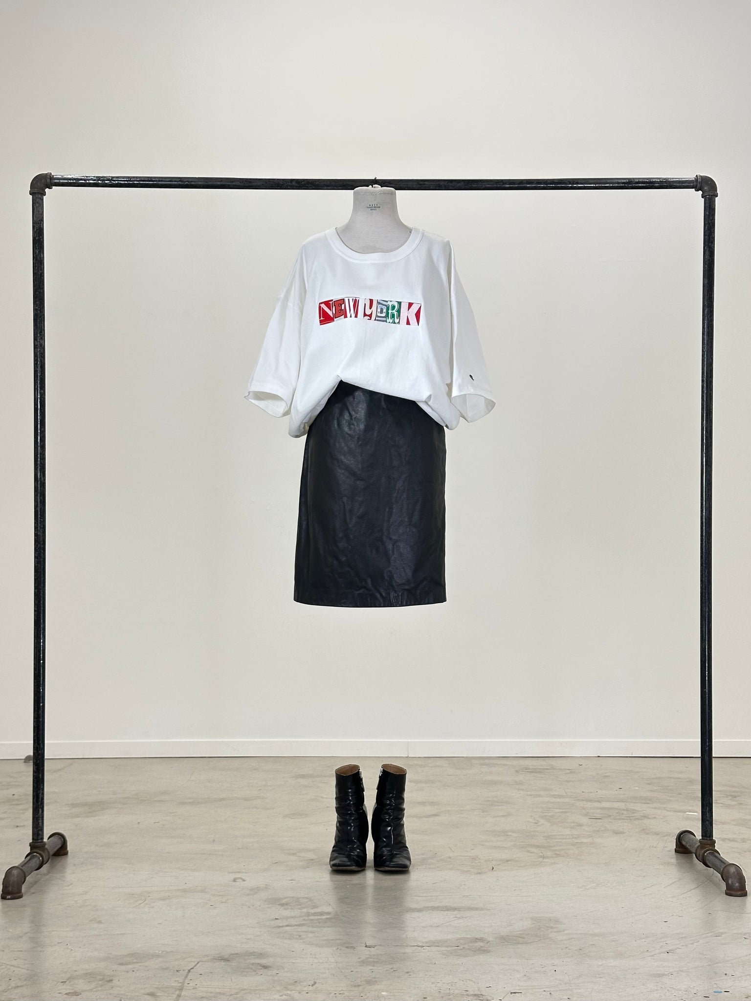 Each letter is cut from vintage T-shirts and individually stitched to create a one-of-a-kind graphic.