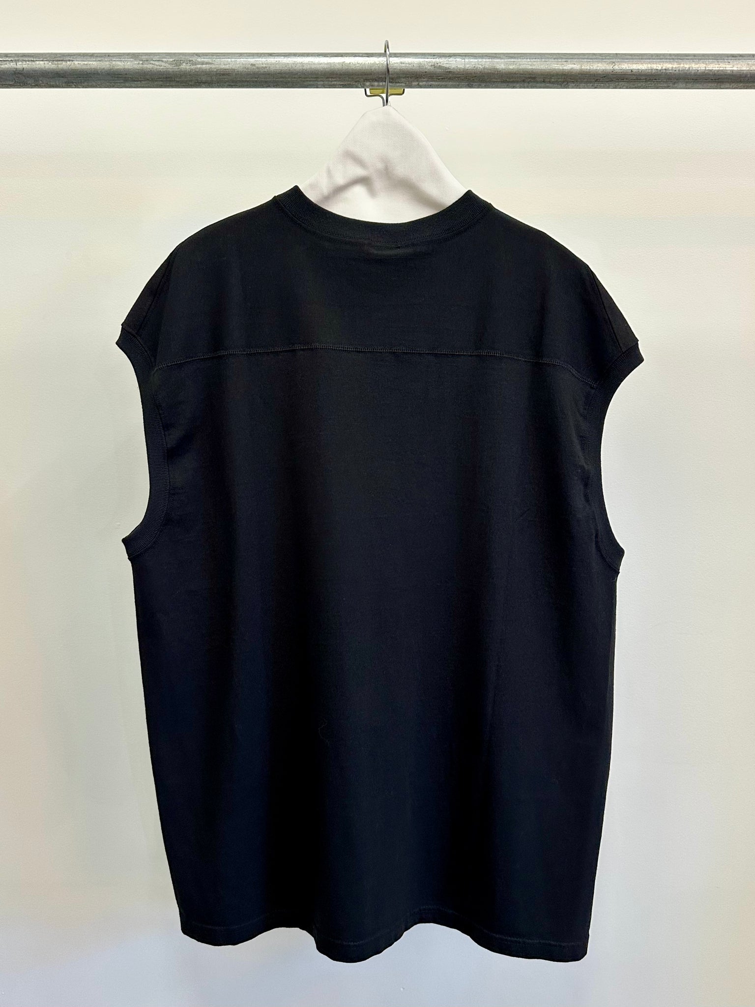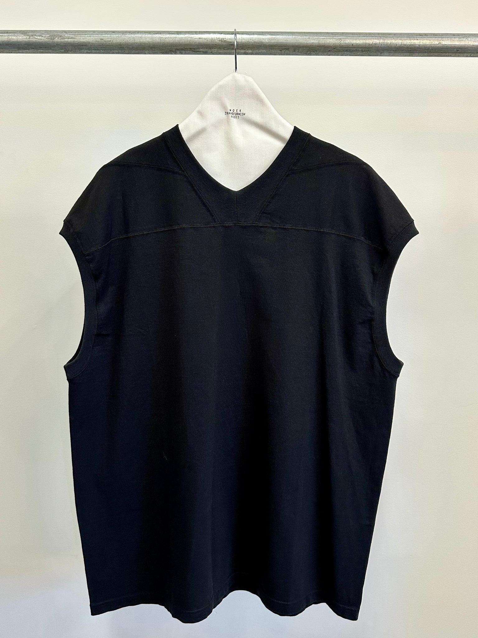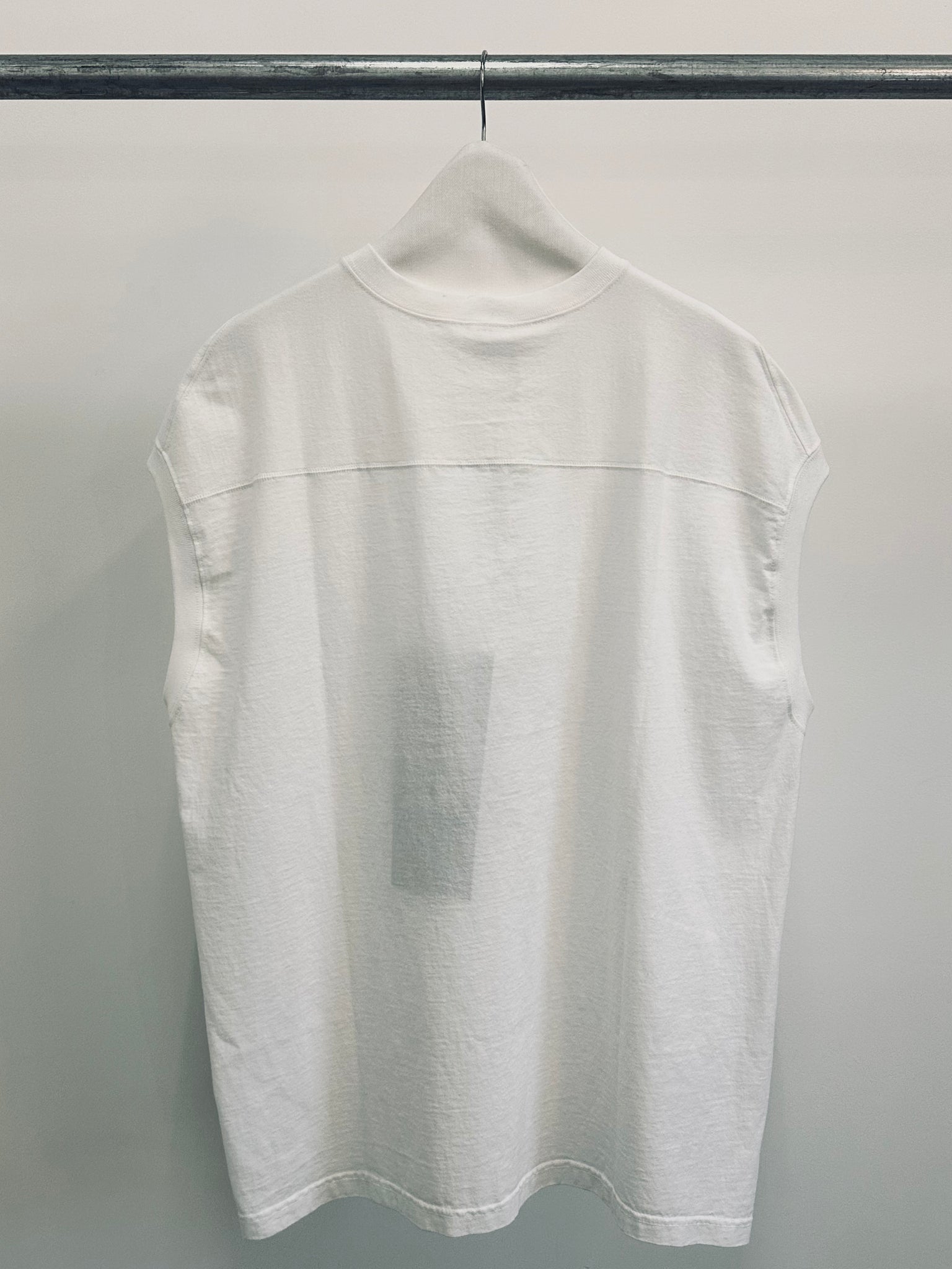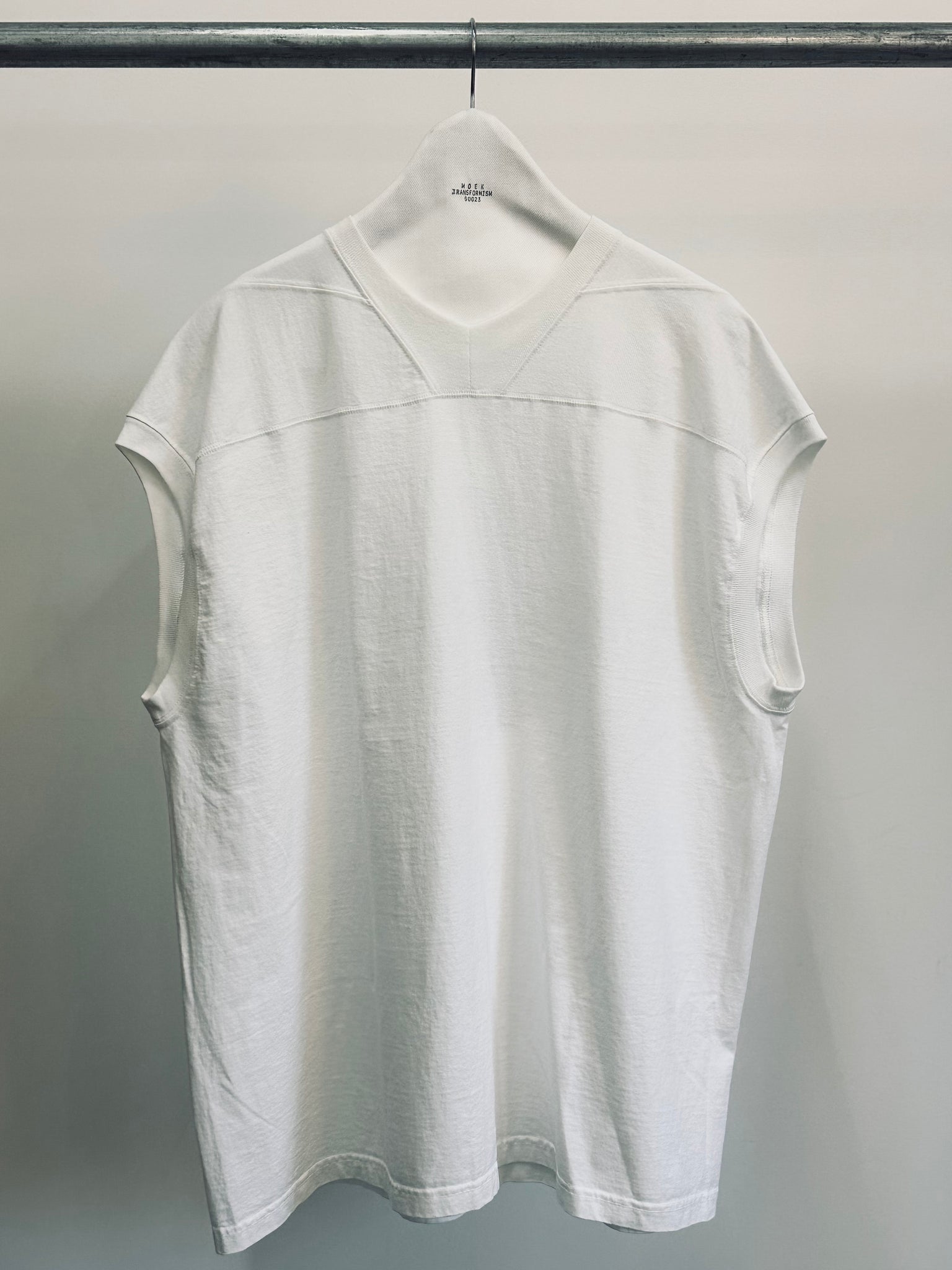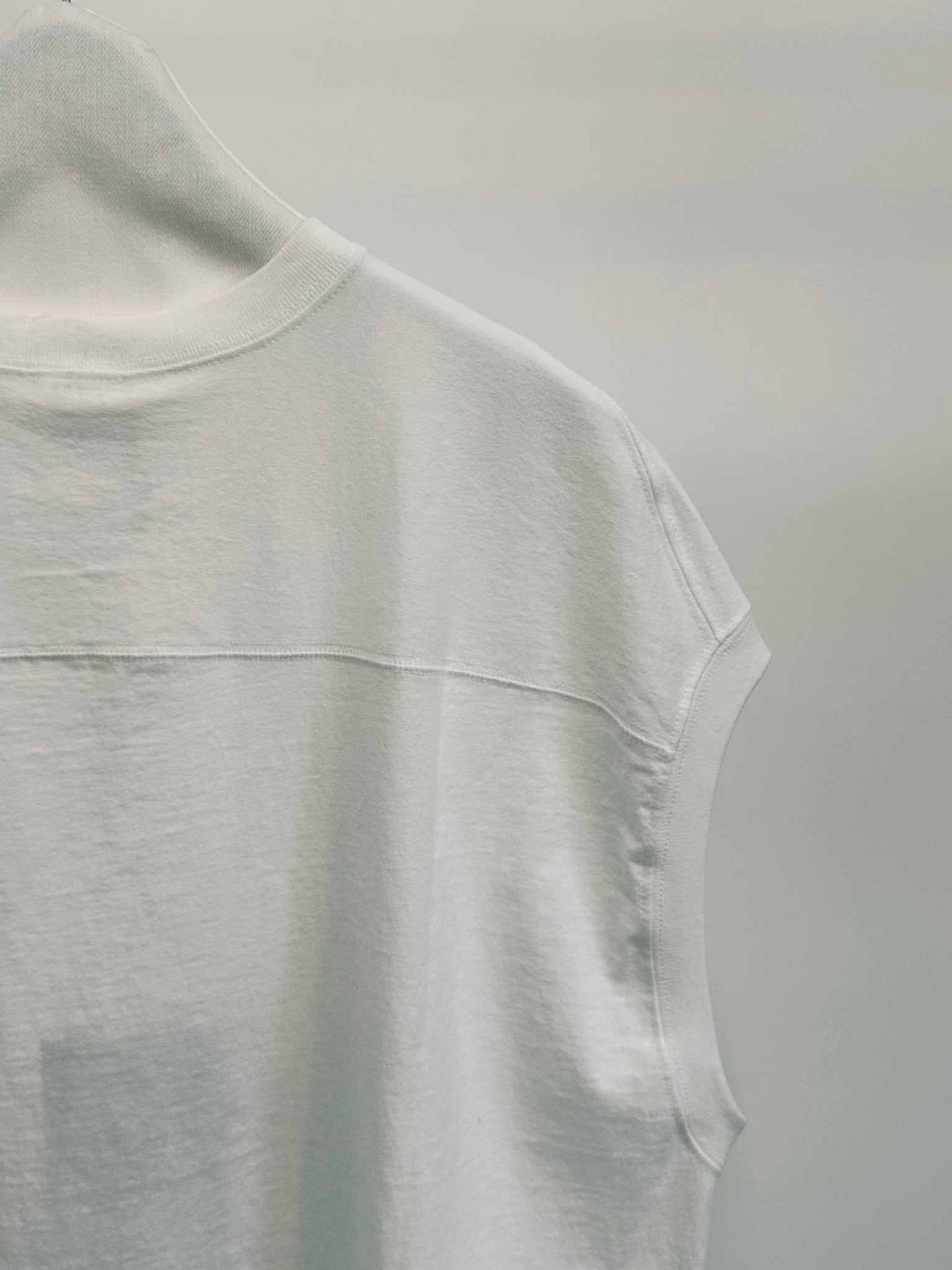This sleeveless T-shirt is reconstructed from a 7.5oz T-shirt by a renowned bodywear manufacturer, completely reimagined through our original pattern-making process. Featuring uniquely cut shoulders that gently wrap around the upper arm and a custom-designed neckband exclusive to MOEK, this piece delivers a bold yet refined silhouette that stands apart from ordinary basics.